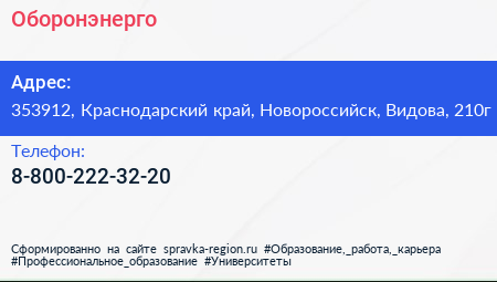 Оборонэнерго по адресу 353912, Краснодарский край, Новороссийск, Видова, 210г в дальнейшем Организация, размещена в следующих категориях: