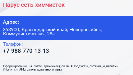 Парус, сеть химчисток по адресу 353900, Краснодарский край, Новороссийск, Коммунистическая, 28а в дальнейшем Организация, размещена в следующих категориях: