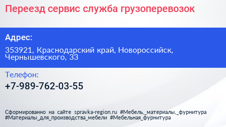 Переезд сервис, служба грузоперевозок по адресу 353921, Краснодарский край, Новороссийск, Чернышевского, 33 в дальнейшем Организация, размещена в следующих категориях: