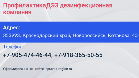 ПрофилактикаДЭЗ, дезинфекционная компания по адресу 353993, Краснодарский край, Новороссийск, Котанова, 40 в дальнейшем Организация, размещена в следующих категориях: