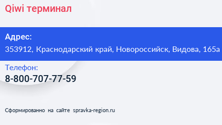 Qiwi, терминал по адресу 353912, Краснодарский край, Новороссийск, Видова, 165а в дальнейшем Организация, размещена в следующих категориях:
