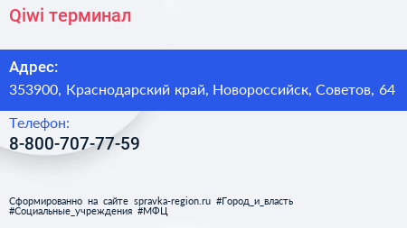 Qiwi, терминал по адресу 353900, Краснодарский край, Новороссийск, Советов, 64 в дальнейшем Организация, размещена в следующих категориях: