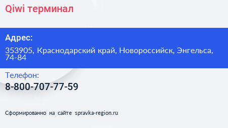 Qiwi, терминал по адресу 353905, Краснодарский край, Новороссийск, Энгельса, 74-84 в дальнейшем Организация, размещена в следующих категориях: