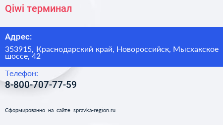 Qiwi, терминал по адресу 353915, Краснодарский край, Новороссийск, Мысхакское шоссе, 42 в дальнейшем Организация, размещена в следующих категориях: