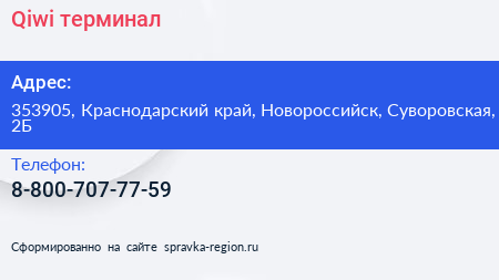 Qiwi, терминал по адресу 353905, Краснодарский край, Новороссийск, Суворовская, 2Б в дальнейшем Организация, размещена в следующих категориях: