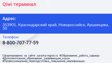 Qiwi, терминал по адресу 353901, Краснодарский край, Новороссийск, Аршинцева, 50 в дальнейшем Организация, размещена в следующих категориях: