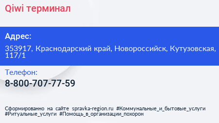 Qiwi, терминал по адресу 353917, Краснодарский край, Новороссийск, Кутузовская, 117/1 в дальнейшем Организация, размещена в следующих категориях: