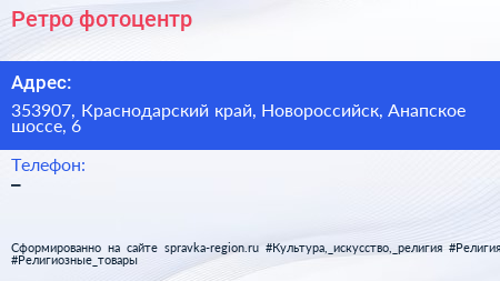 Ретро, фотоцентр по адресу 353907, Краснодарский край, Новороссийск, Анапское шоссе, 6 в дальнейшем Организация, размещена в следующих категориях: