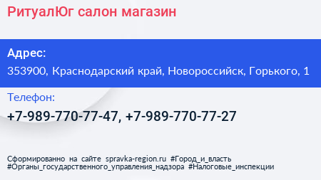 РитуалЮг, салон-магазин по адресу 353900, Краснодарский край, Новороссийск, Горького, 1 в дальнейшем Организация, размещена в следующих категориях: