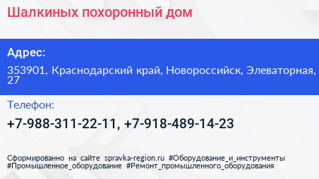 Шалкиных, похоронный дом по адресу 353901, Краснодарский край, Новороссийск, Элеваторная, 27 в дальнейшем Организация, размещена в следующих категориях: