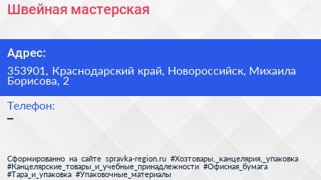 Швейная мастерская по адресу 353901, Краснодарский край, Новороссийск, Михаила Борисова, 2 в дальнейшем Организация, размещена в следующих категориях: