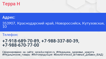 Терра-Н по адресу 353907, Краснодарский край, Новороссийск, Кутузовская, 10 в дальнейшем Организация, размещена в следующих категориях: