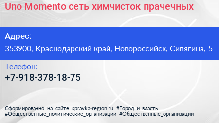 Uno Momento, сеть химчисток-прачечных по адресу 353900, Краснодарский край, Новороссийск, Сипягина, 5 в дальнейшем Организация, размещена в следующих категориях:
