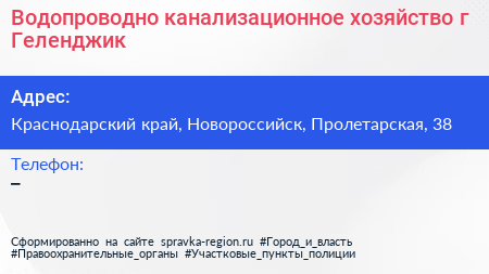 Водопроводно-канализационное хозяйство, г. Геленджик по адресу Краснодарский край, Новороссийск, Пролетарская, 38 в дальнейшем Организация, размещена в следующих категориях: