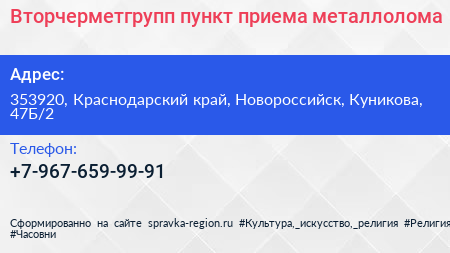 Вторчерметгрупп, пункт приема металлолома по адресу 353920, Краснодарский край, Новороссийск, Куникова, 47Б/2 в дальнейшем Организация, размещена в следующих категориях: