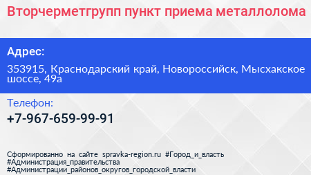 Вторчерметгрупп, пункт приема металлолома по адресу 353915, Краснодарский край, Новороссийск, Мысхакское шоссе, 49а в дальнейшем Организация, размещена в следующих категориях: