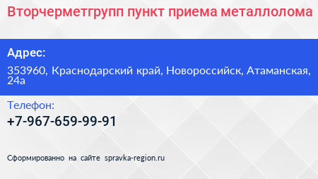 Вторчерметгрупп, пункт приема металлолома по адресу 353960, Краснодарский край, Новороссийск, Атаманская, 24а в дальнейшем Организация, размещена в следующих категориях: