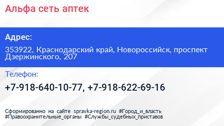Альфа, сеть аптек по адресу 353922, Краснодарский край, Новороссийск, проспект Дзержинского, 207 в дальнейшем Организация, размещена в следующих категориях: