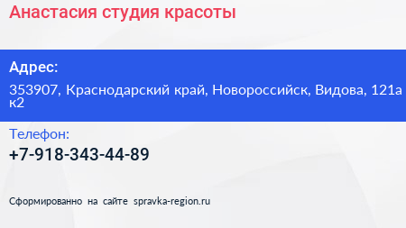 Анастасия, студия красоты по адресу 353907, Краснодарский край, Новороссийск, Видова, 121а к2 в дальнейшем Организация, размещена в следующих категориях: