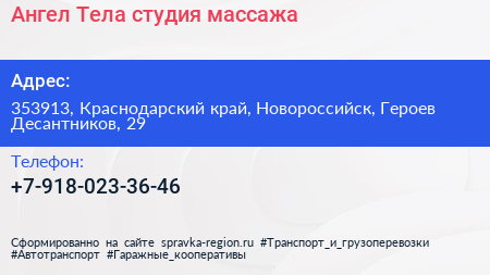 Ангел Тела, студия массажа по адресу 353913, Краснодарский край, Новороссийск, Героев Десантников, 29 в дальнейшем Организация, размещена в следующих категориях: