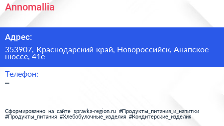 Annomallia по адресу 353907, Краснодарский край, Новороссийск, Анапское шоссе, 41е в дальнейшем Организация, размещена в следующих категориях: