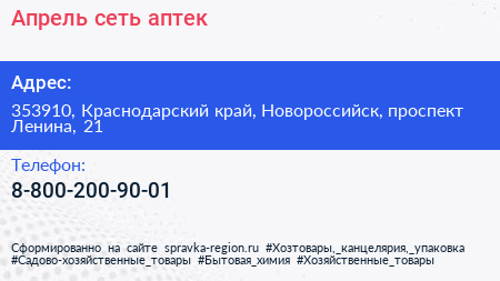 Апрель, сеть аптек по адресу 353910, Краснодарский край, Новороссийск, проспект Ленина, 21 в дальнейшем Организация, размещена в следующих категориях: