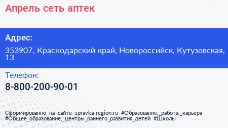 Апрель, сеть аптек по адресу 353907, Краснодарский край, Новороссийск, Кутузовская, 13 в дальнейшем Организация, размещена в следующих категориях: