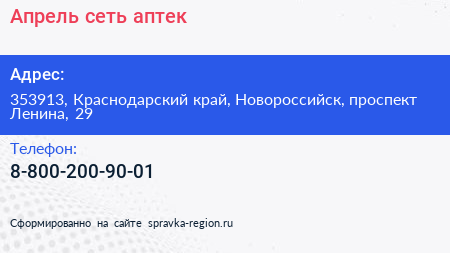 Апрель, сеть аптек по адресу 353913, Краснодарский край, Новороссийск, проспект Ленина, 29 в дальнейшем Организация, размещена в следующих категориях: