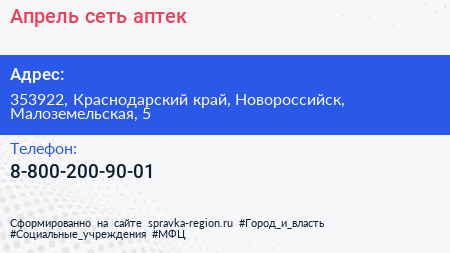 Апрель, сеть аптек по адресу 353922, Краснодарский край, Новороссийск, Малоземельская, 5 в дальнейшем Организация, размещена в следующих категориях: