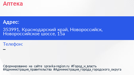 Аптека по адресу 353991, Краснодарский край, Новороссийск, Новороссийское шоссе, 15а в дальнейшем Организация, размещена в следующих категориях: