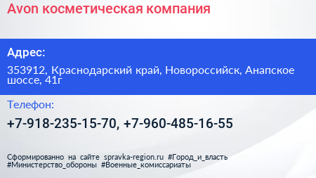 Avon, косметическая компания по адресу 353912, Краснодарский край, Новороссийск, Анапское шоссе, 41г в дальнейшем Организация, размещена в следующих категориях: