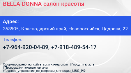 BELLA DONNA, салон красоты по адресу 353905, Краснодарский край, Новороссийск, Цедрика, 22 в дальнейшем Организация, размещена в следующих категориях: