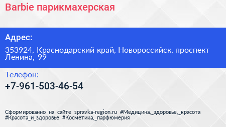 Barbie, парикмахерская по адресу 353924, Краснодарский край, Новороссийск, проспект Ленина, 99 в дальнейшем Организация, размещена в следующих категориях: