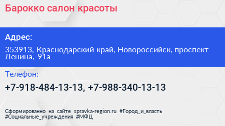 Барокко, салон красоты по адресу 353913, Краснодарский край, Новороссийск, проспект Ленина, 91а в дальнейшем Организация, размещена в следующих категориях: