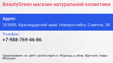 BeautyGreen, магазин натуральной косметики по адресу 353900, Краснодарский край, Новороссийск, Советов, 28 в дальнейшем Организация, размещена в следующих категориях: