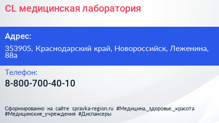 CL, медицинская лаборатория по адресу 353905, Краснодарский край, Новороссийск, Леженина, 88а в дальнейшем Организация, размещена в следующих категориях: