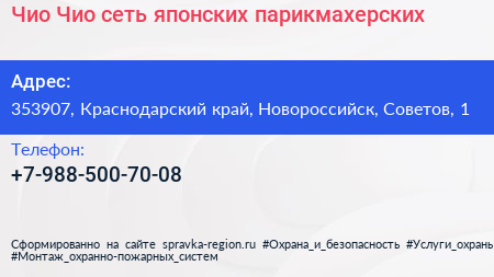 Чио Чио, сеть японских парикмахерских по адресу 353907, Краснодарский край, Новороссийск, Советов, 1 в дальнейшем Организация, размещена в следующих категориях:
