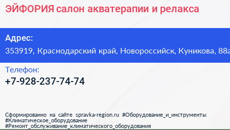 ЭЙФОРИЯ, салон акватерапии и релакса по адресу 353919, Краснодарский край, Новороссийск, Куникова, 88а в дальнейшем Организация, размещена в следующих категориях: