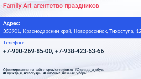 Family Art, агентство праздников по адресу 353901, Краснодарский край, Новороссийск, Тихоступа, 12 в дальнейшем Организация, размещена в следующих категориях:
