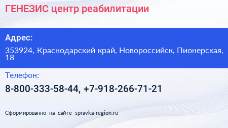 ГЕНЕЗИС, центр реабилитации по адресу 353924, Краснодарский край, Новороссийск, Пионерская, 18 в дальнейшем Организация, размещена в следующих категориях: