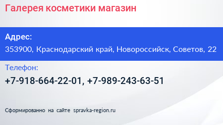 Галерея косметики, магазин по адресу 353900, Краснодарский край, Новороссийск, Советов, 22 в дальнейшем Организация, размещена в следующих категориях: