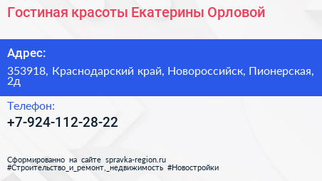 Гостиная красоты Екатерины Орловой по адресу 353918, Краснодарский край, Новороссийск, Пионерская, 2д в дальнейшем Организация, размещена в следующих категориях: