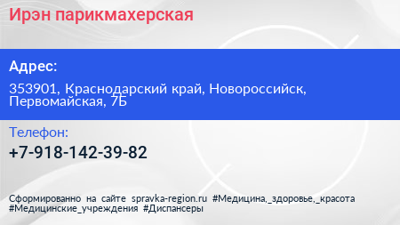 Ирэн, парикмахерская по адресу 353901, Краснодарский край, Новороссийск, Первомайская, 7Б в дальнейшем Организация, размещена в следующих категориях: