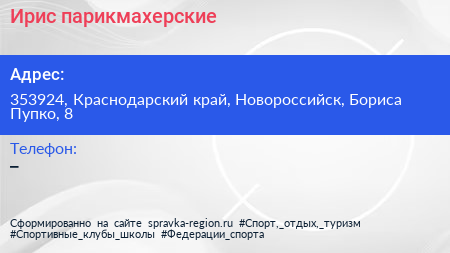 Ирис, парикмахерские по адресу 353924, Краснодарский край, Новороссийск, Бориса Пупко, 8 в дальнейшем Организация, размещена в следующих категориях: