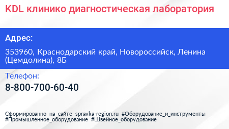 KDL, клинико-диагностическая лаборатория по адресу 353960, Краснодарский край, Новороссийск, Ленина (Цемдолина), 8Б в дальнейшем Организация, размещена в следующих категориях: