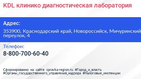 KDL, клинико-диагностическая лаборатория по адресу 353900, Краснодарский край, Новороссийск, Мичуринский переулок, 4 в дальнейшем Организация, размещена в следующих категориях: