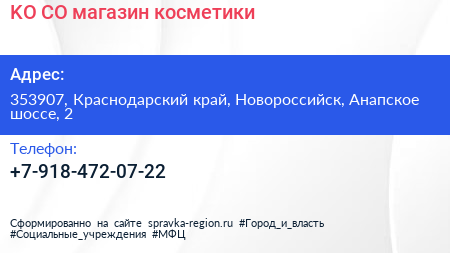 KO CO, магазин косметики по адресу 353907, Краснодарский край, Новороссийск, Анапское шоссе, 2 в дальнейшем Организация, размещена в следующих категориях: