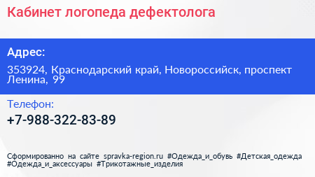 Кабинет логопеда-дефектолога по адресу 353924, Краснодарский край, Новороссийск, проспект Ленина, 99 в дальнейшем Организация, размещена в следующих категориях: