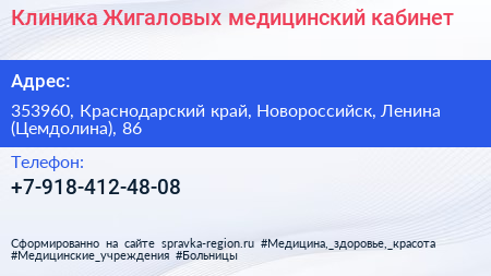 Клиника Жигаловых, медицинский кабинет по адресу 353960, Краснодарский край, Новороссийск, Ленина (Цемдолина), 86 в дальнейшем Организация, размещена в следующих категориях: