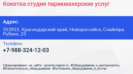 Кокетка, студия парикмахерских услуг по адресу 353923, Краснодарский край, Новороссийск, Снайпера Рубахо, 23 в дальнейшем Организация, размещена в следующих категориях: